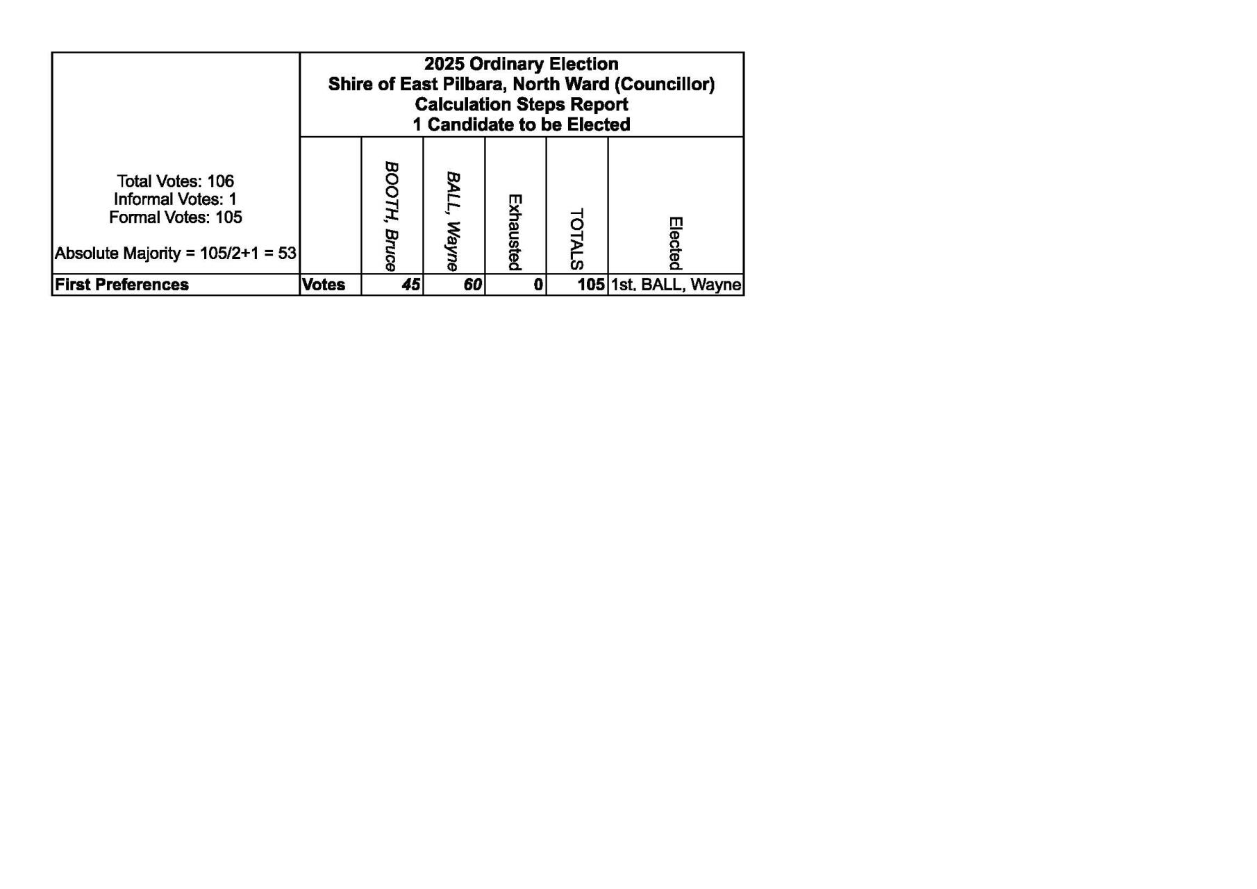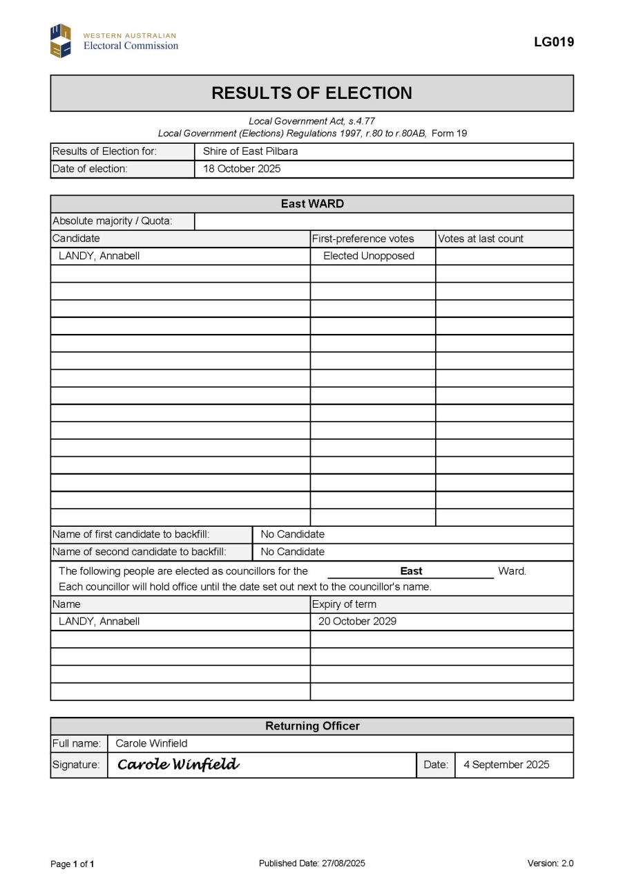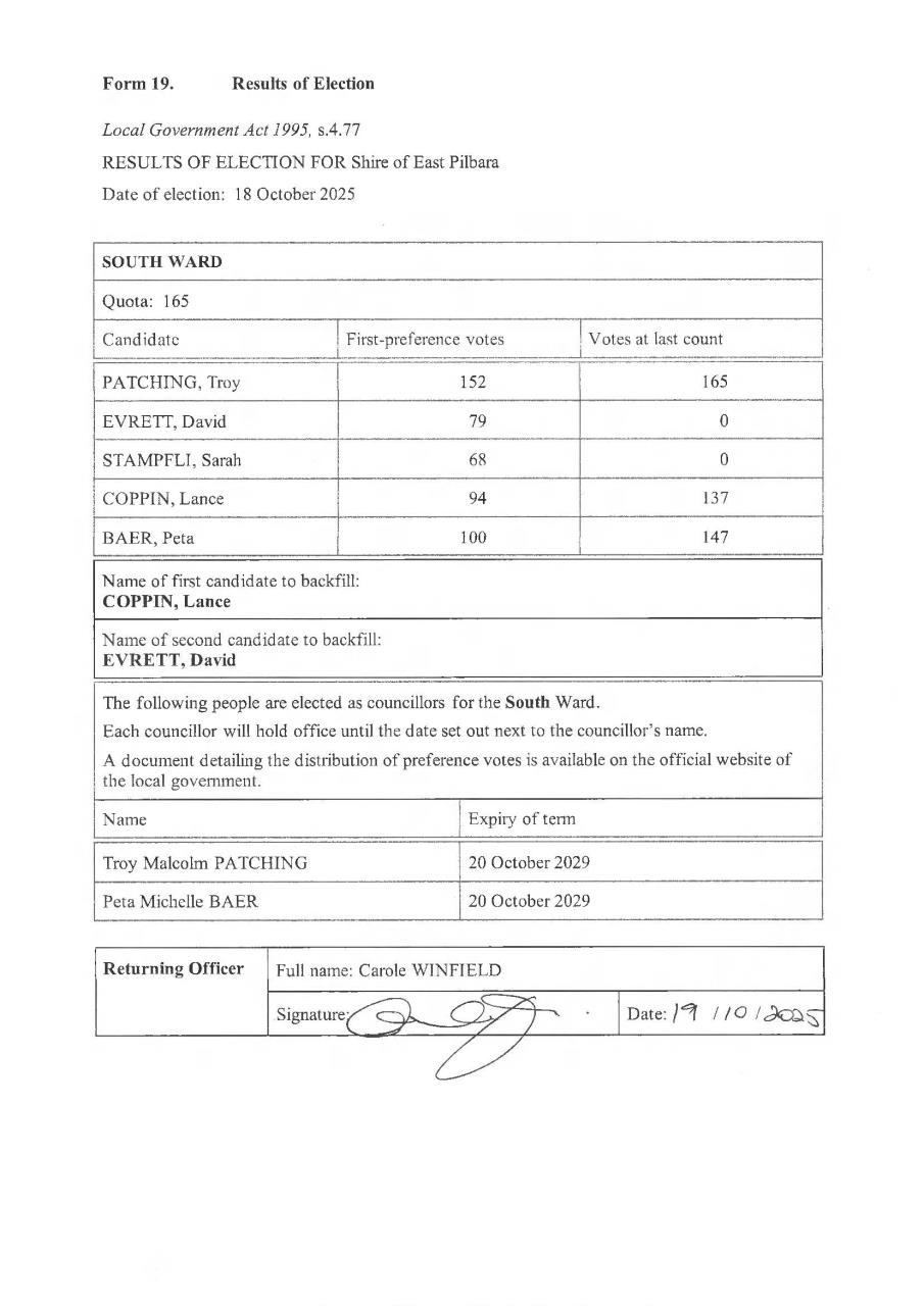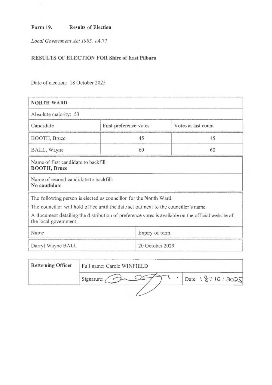 Following are the declared results of the local government ordinary elections held for the Council of the Shire of East Pilbara on Saturday, 18 October 2025: