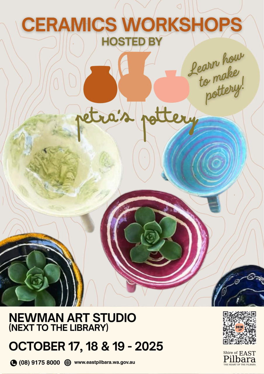 The Shire of East Pilbara is excited to announce 6 ceramics workshops, held over 3 days in October. We're even more excited to reopen the doors to the Newman Art Studio (next to Newman Library) and offer the community to a space to create, connect and learn new skills