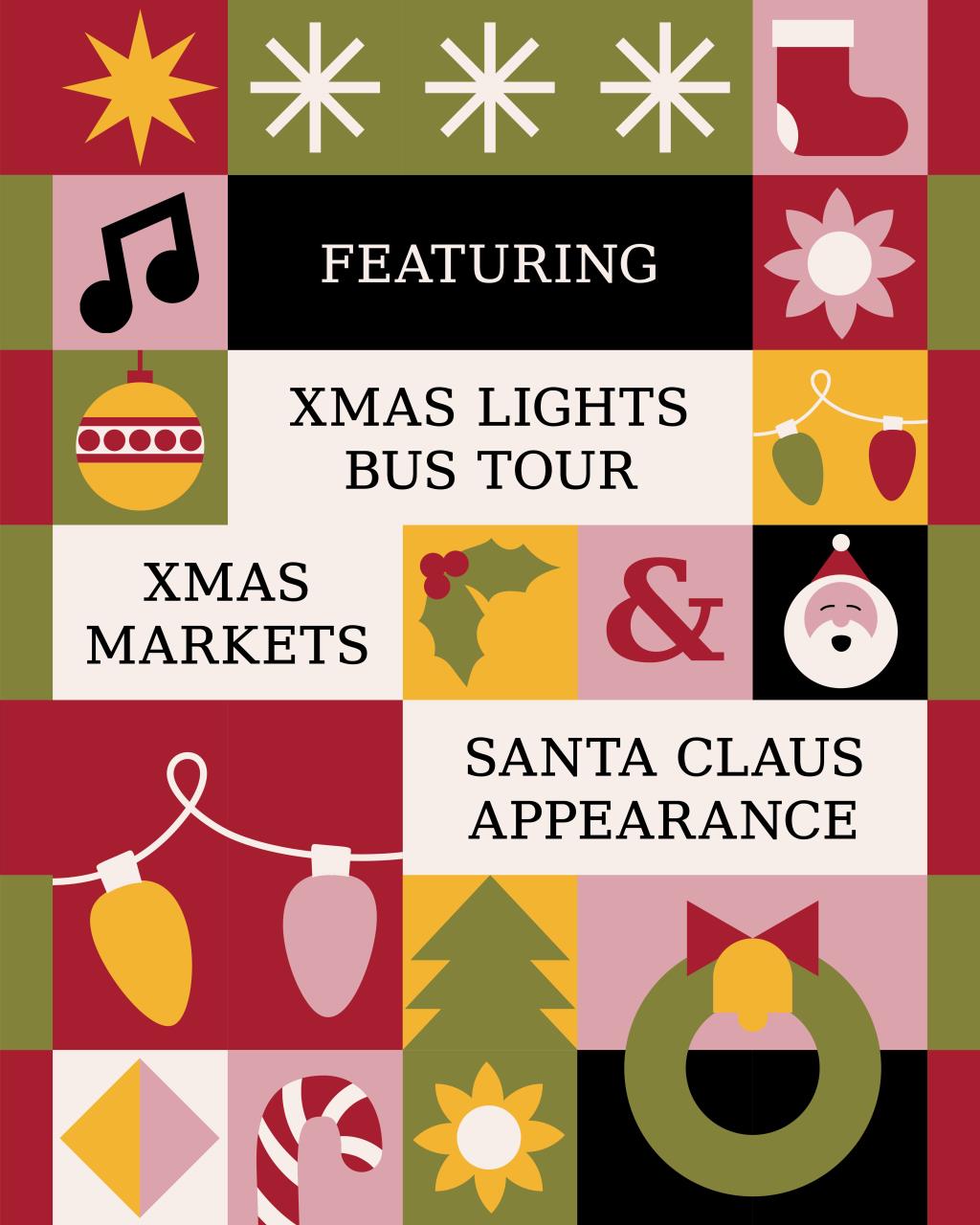 | Christmas Lights Bus Tour| Christmas Carols | Outback Karaoke | Markets | Appearance from Santa Claus