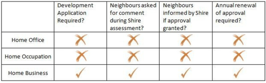 The Shire allows three types of home-based business, with the controls and approval processes reflecting the type of activity and the impact on residential amenity. The three types are home office, home occupation and home business. Home Office and Home Occupations are generally exempt from the need to obtain development approval.