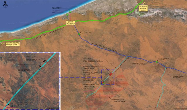 The AREH study area is located towards the northern extent of the Shire and occupies an area of approximately 6,500 km and is approximately 90km in length (north-south). The portion of this area proposed to be occupied by the “Temporary Workforce Accommodation” and “Temporary Airfield” is located approximately 30km south-west of the Nyangumarta Highway, 63km south of the Eighty Mile Beach coastal area and 160km north-east of Marble Bar. The proposal occupies a small portion of the overall AREH study area.